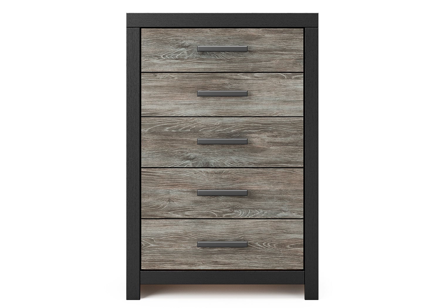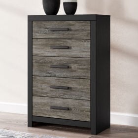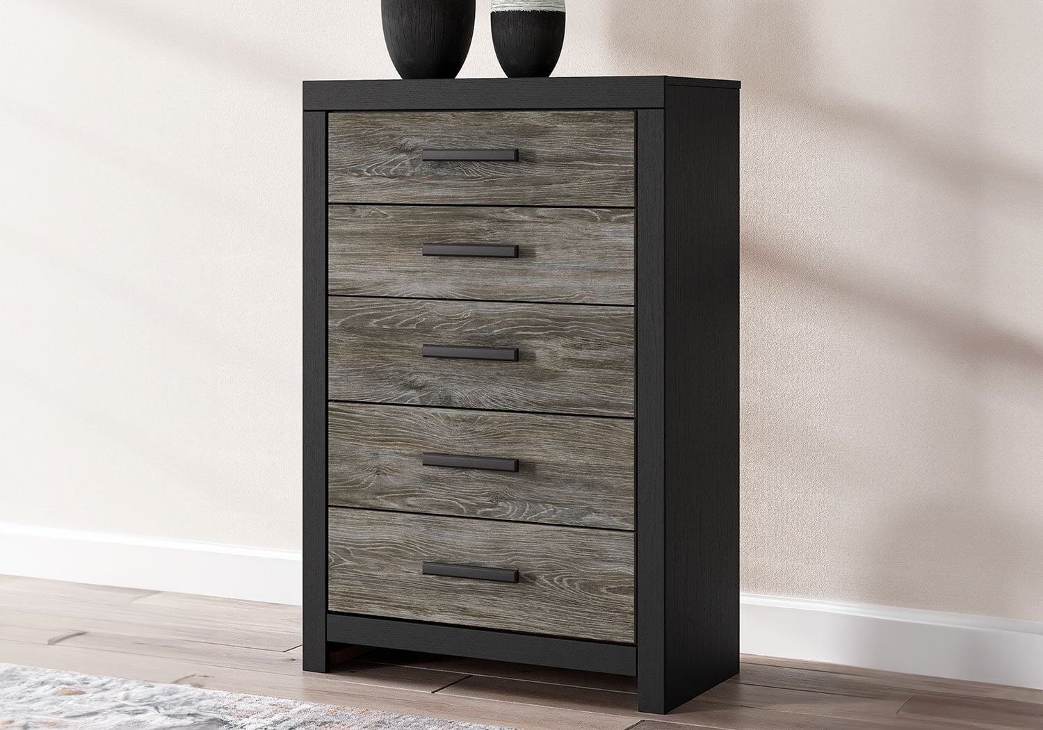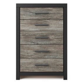 This Series evokes the tranquil vibe you long for in your dream destination. Its two-tone textured look marries a rustic gray finish and a matte black finish over replicated oak grain for neutral appeal. Both functional and versatile, its roomy drawers with large-scale handles offer easy access to hidden storage for cozy sweaters, casual tees and so much more.