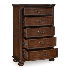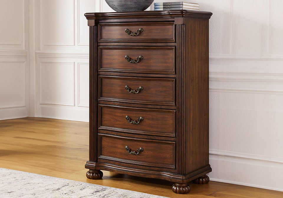Take inspiration from the traditional luxury of this chest of drawers. Classic with a rich cherry brown finish, its stately presence graces your room with an air of opulence. Your taste for exquisite details is satisfied with decorative drawer pulls and chic bun feet. With five drawers acting as elegant hosts for clothes and other essentials, your restful retreat has never been so refined.