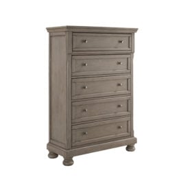 Satisfying your taste for tradition, this chest of drawers sports serene sophistication. Forever classic design details—inlaid panels, silvertone patina hardware and bun feet—are so easy to love. Burnished light gray finish elevates the look with modern sensibility. Five roomy drawers keep your wardrobe organized in style.