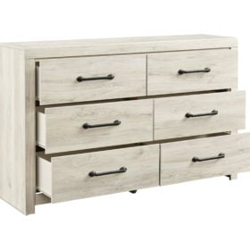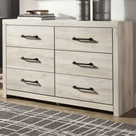 What a delightful take on rustic industrial style. Whether modern loft or modern farmhouse, this dresser makes itself at home. The wispy whitewash palette enhances without covering the grain for that weathered look you crave. Elongated metal drawer pulls elevate the aesthetic.