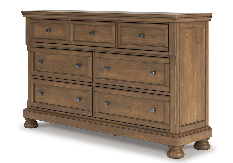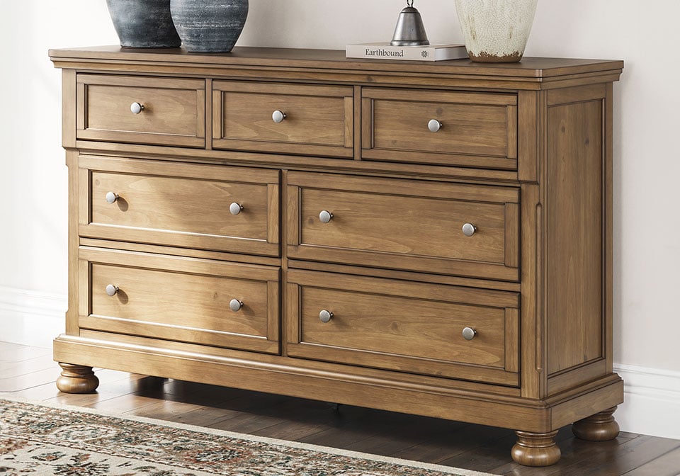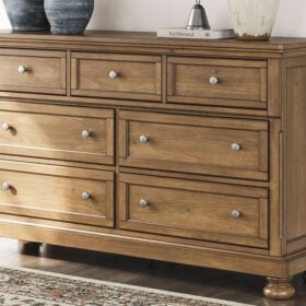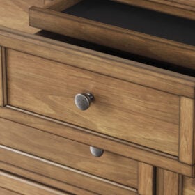 A relaxed take on casual traditional design, this Series strikes a comfy pose with a classic sensibility. Its timeless design and chestnut brown wood tone create a welcoming retreat tailored to your laid-back lifestyle. Metal knobs in an aged pewter color subtly dress up drawers packed with storage possibilities. A hidden pull-out tray behind the top center drawer keeps your small valuables out of sight.