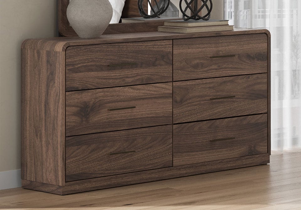 Grace your restful retreat with an added dose of refinement. This Panel Series showcases a stunning rich brown wood tone, Case pieces with sleek drawer pulls for an added layer of luxury, while the rounded frame softens its silhouette to elevate the look. And it seamlessly incorporates forward-thinking function, with an LED backlight in the headboard that can be easily accessed from both sides. It’s curated, contemporary and utterly chic.