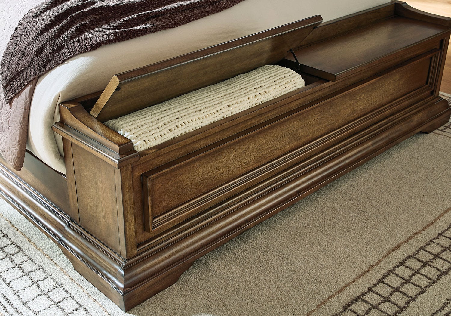 Made with hardwood solids, birch veneer and MDF substrate. Side rails feature laminated solid hardwood slat support rails (or LVL) with glued and screwed blocking for added strength. Multi-step brown finish using stains and glaze with hand-rubbed details. Double-hinged storage bench in footboard. Foundation required.