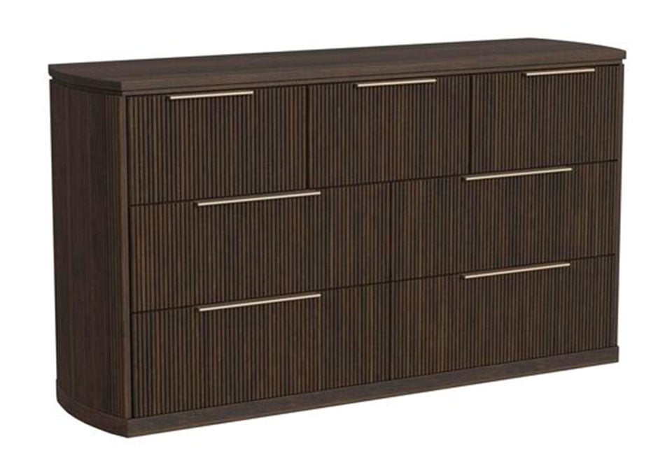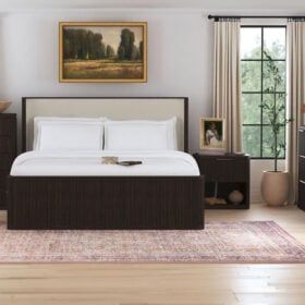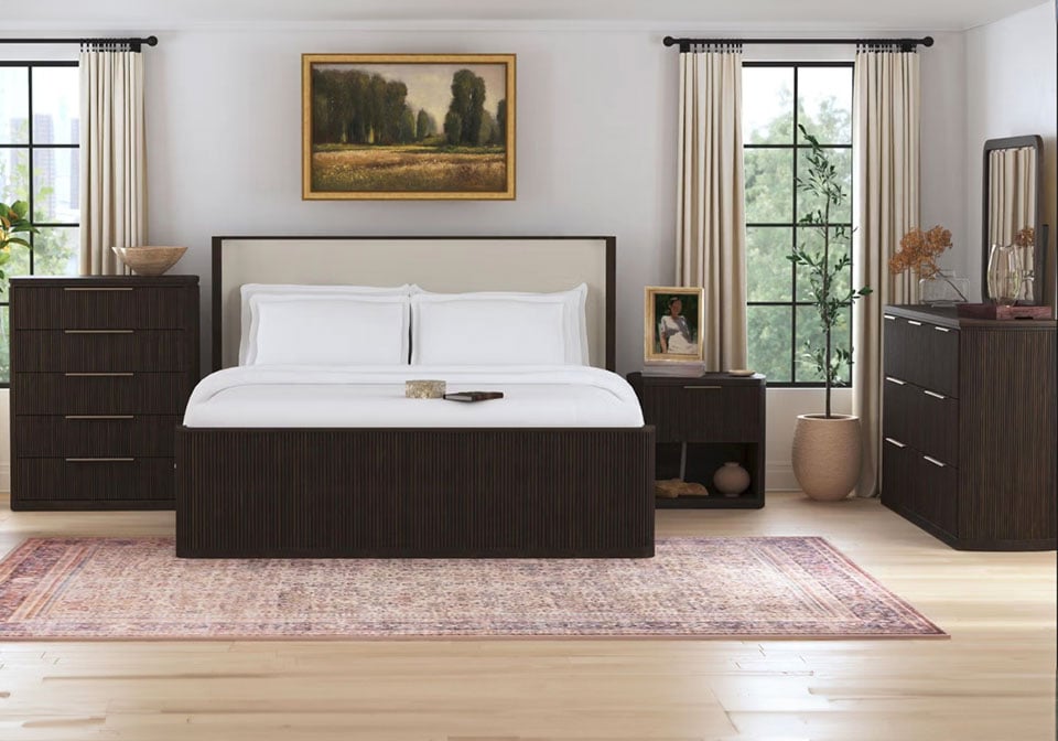 Transform your bedroom into a luxurious retreat with this Dark Brown Upholstered Bedroom Set. Featuring a rich finish, contrast fabric panels, and sleek modern design, it offers timeless style, sturdy craftsmanship, and ample storage for a truly elegant, functional space.