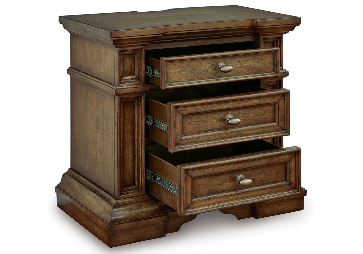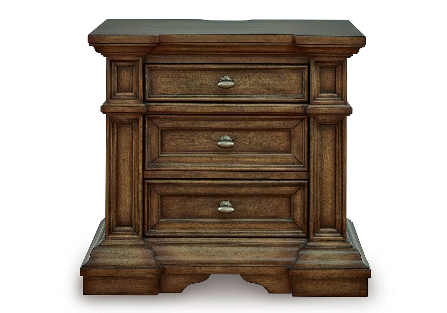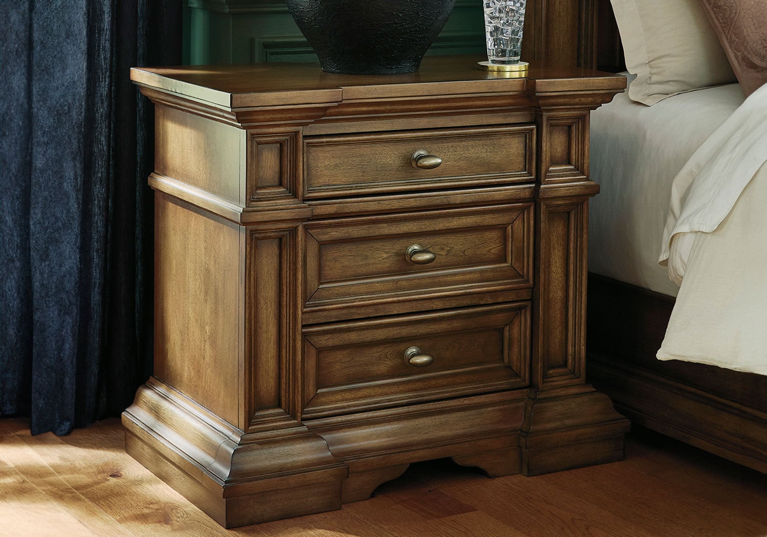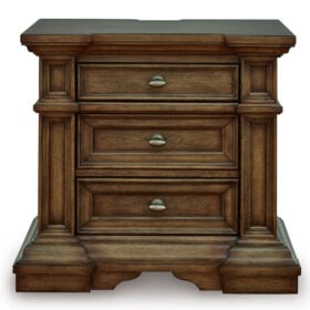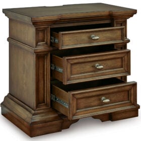 Made with hardwood solids, birch veneer and MDF substrate. Multi-step brown finish using stains and glaze with hand-rubbed details. Large metal oval knobs with antiqued brass-tone finish. Smooth-gliding drawers with fully finished interiors, dovetail construction and heavy-duty ball-bearing side glides. Top drawers felt lined. Night Stand with AC outlet, USB-A, & USB-C charging ports.