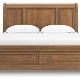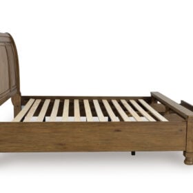 A relaxed take on casual traditional design, this storage sleigh Series strikes a comfy pose with a classic sensibility. Its timeless design and chestnut brown wood-tone create a welcoming retreat tailored to your laid-back lifestyle. Metal knobs in an aged pewter color subtly dress up footboard drawers packed with storage possibilities. Now there’s a Series with staying power.