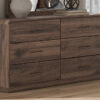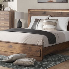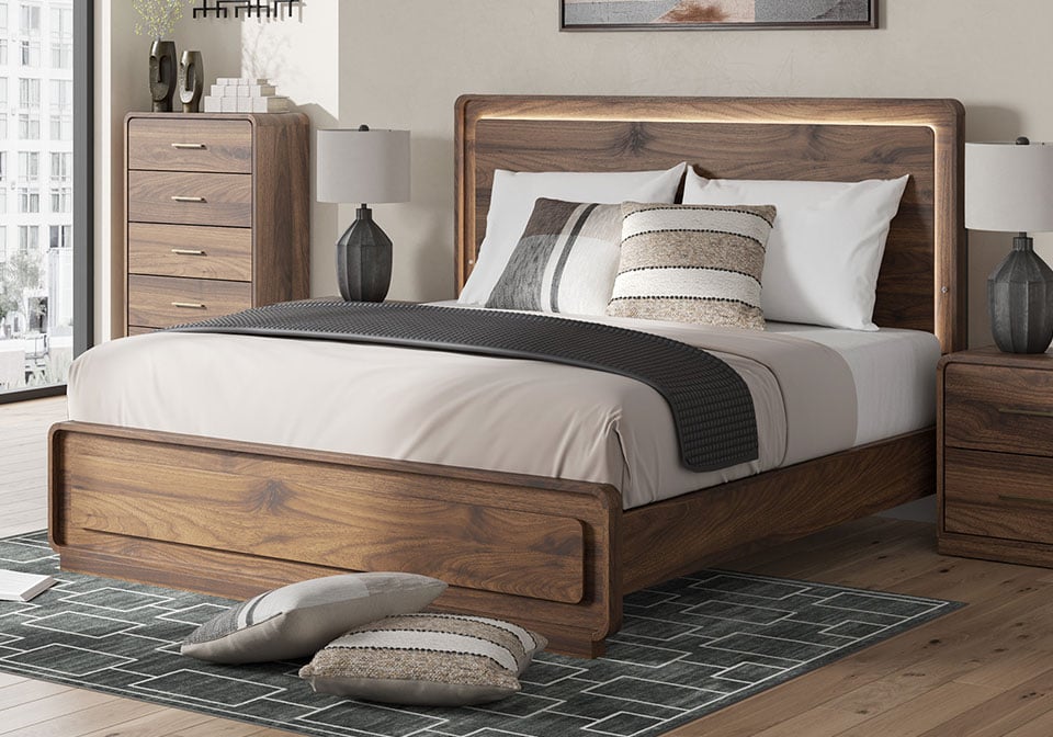 Made with MDF substrates and decorative paper laminate. Replicated walnut wood grain with high-low contrast for a rich brown wood tone. LED backlight feature with 3-way dimmer switch; operates from both sides of the bed. Case pieces with smooth-gliding drawers with English dovetail construction and center mount drawer guides. Drawer interiors lined with decorative wood grain paper laminate. Bed does not require additional foundation/box spring; accommodates most zero clearance adjustable bases.