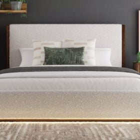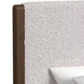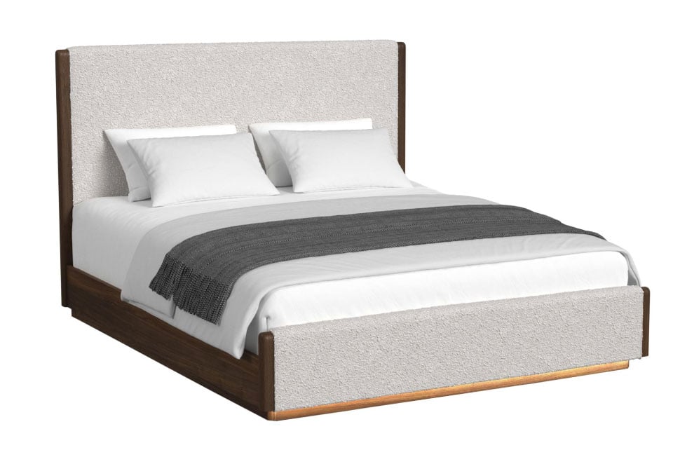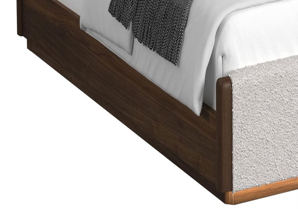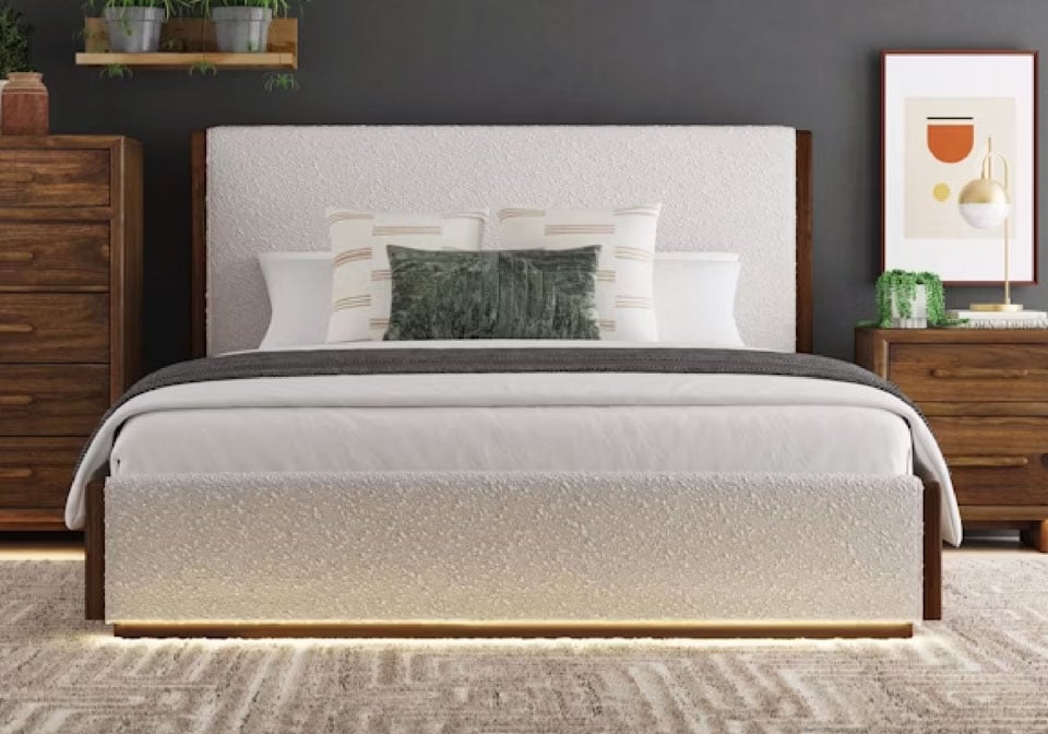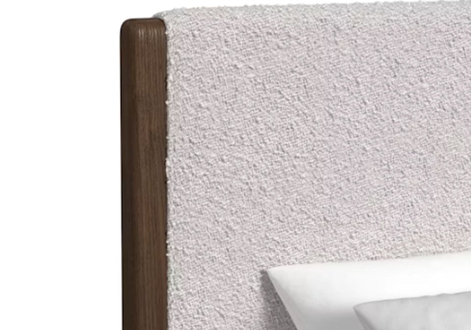 Mid-century modern design. Solid wood construction. Rich walnut veneer finish. Boucle upholstered headboard and footboard. Integrated LED lighting. USB charging ports on nightstands. Dovetail drawer construction. Smooth ball-bearing glides. Sturdy metal hardware. Exceptional craftsmanship.
