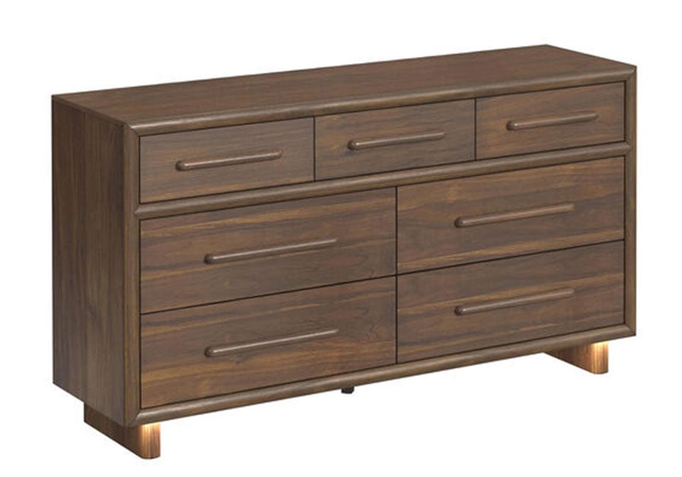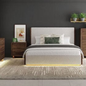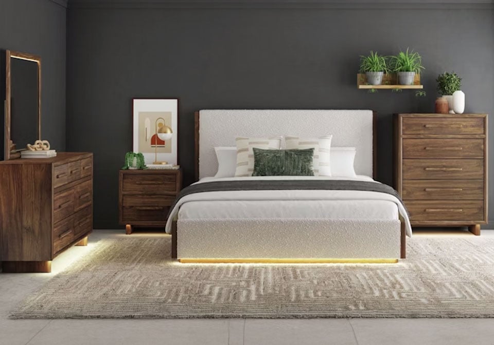 Transform your bedroom with Series, blending mid-century warmth and modern convenience. Crafted from solid wood with walnut veneer, it features LED lighting, boucle upholstery, Case pieces with dovetail drawers, and USB ports for timeless style and lasting quality.
