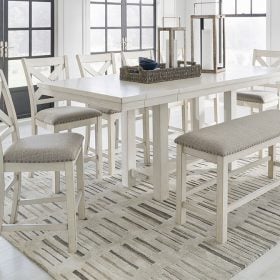 This counter height dining Series is sure to impress come mealtime. With its antiqued white finish and a planked effect tabletop that extends for additional seating, & Seating with light gray upholstery, farmhouse-style dining has never been so fashionable. All that’s missing is you and your family.