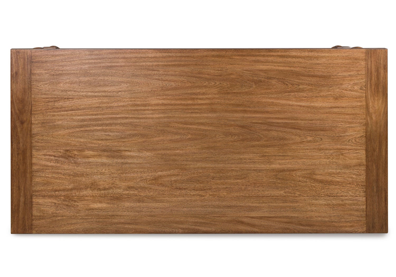 Made with hardwood solids, mango wood veneer and MDF substrate. Medium brown wood-tone finish. Table Seats up to 8.
