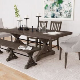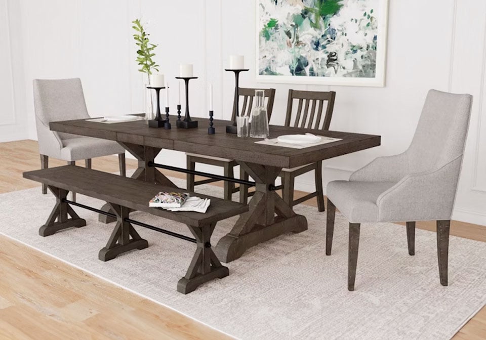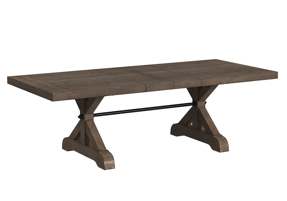 Warm textured finish. Timeless craftsmanship. Sturdy trestle base. Reinforcing metal bar. Broad dining surface. Two 12″ extension leaves. Versatile length options. Featuring two Host Chairs & Elegant Bench. Farmhouse-inspired style. Perfect for everyday meals or special occasions.