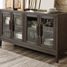 Dressed to thrill, this simply stunning dining server offers a high-design look at a down-to-earth price. Ultra sleek lines are accentuated with a dark waxy brown oak-tone finish that’s so easy on the eyes. Custom bar pulls on the double-door cabinets emphasize the server’s clean, modern lines, while their brass-tone finish and metal accents in the same coloration complete the upscale aesthetic. Beautiful inside and out, glass front doors showcase the adjustable shelving to create a display and storage piece with a timeless look that’s made to last.