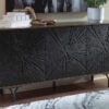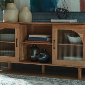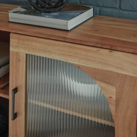 Simply chic storage awaits with this accent cabinet. With the versatility to act as a classic sideboard or a trendy TV stand, it’s at home in settings ranging from casual to modern. Doors with curved half-arch glass inserts soften the clean-lined look, while the removable shelves inside give you that much more flexibility. Openings in the back for electronics keep cables neatly organized, and the open middle shelving acts as a perfect host for media consoles.
