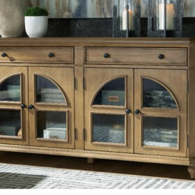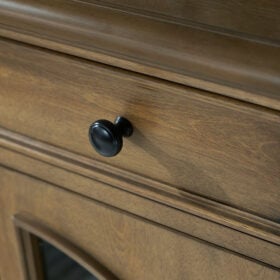 This lovely accent cabinet is a masterful blend of classic charm and practicality. A light brown finish and arched glass panel doors create a timeless look, while the spacious drawers and adjustable shelves offer versatile storage options. Convenient openings in the back for electronics keep those ugly cords out of sight.