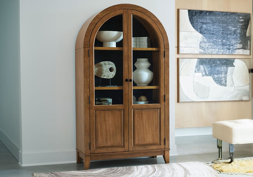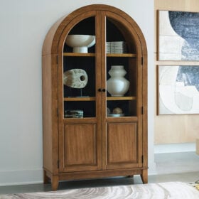 This accent cabinet is a stunning marriage of architectural intrigue and sophisticated storage. Its glass-paneled doors and natural wood tone create an inviting warmth well-suited to transitional spaces. Ideal for showcasing fine china or storing everyday essentials, this versatile piece proves that practical storage can be utterly beautiful.