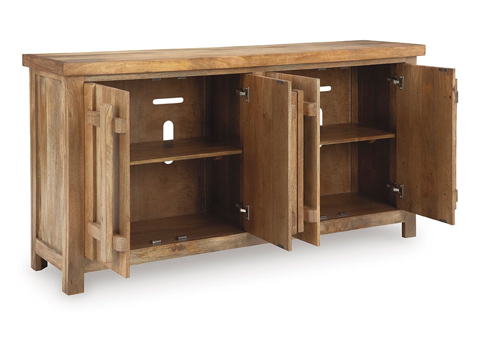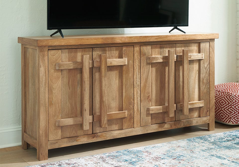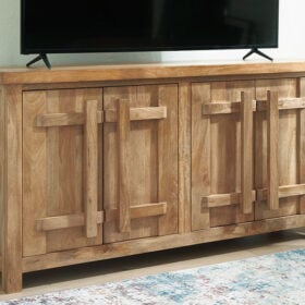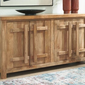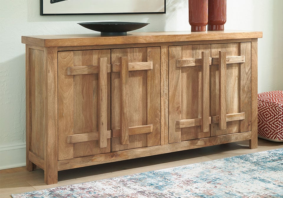 Say hello to style and bid farewell to clutter without compromising on design. This accent cabinet radiates refined modern craftsman influence. Impressive detailing and cabinets with dynamic oversized wooden pulls create organic appeal. Offering ample storage space for your essentials, don’t just organize your home—artfully arrange it.