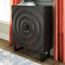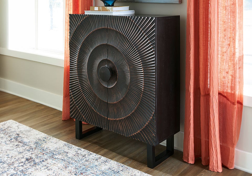 High style is on the rise with this wood accent cabinet. Its stunning doors, graced with a carved sunburst pattern and oversized wood pull, open to reveal two shelves. A distressed black finish adds contemporary flair. Whether this cabinet is accommodating storage needs or hiding clutter, it’s truly a showpiece.