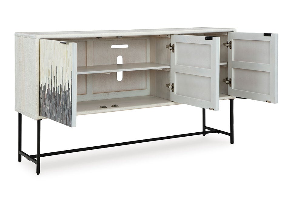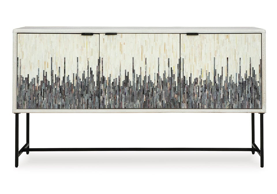 Looking for a showstopping accent for your home? This accent cabinet combines fashion and function in an exclusive way. It offers a creative take on a traditional cabinet, with a strip pattern in white, gray and black. Inside the doors, two shelves suit all your storage needs. Redefine your modern decor with this one-of-a-kind piece.