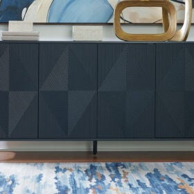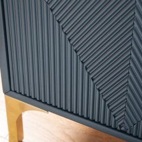 Elevate your aesthetic with the chic design of this accent cabinet. Sleek goldtone legs and striking doors with a geometric pattern infuse contemporary flair wherever you place this piece. Add a dark blue finish, and you’ve got a stunning showstopper. Providing function to form, the cabinet’s push magnetic doors reveal two shelves and openings for electronics.