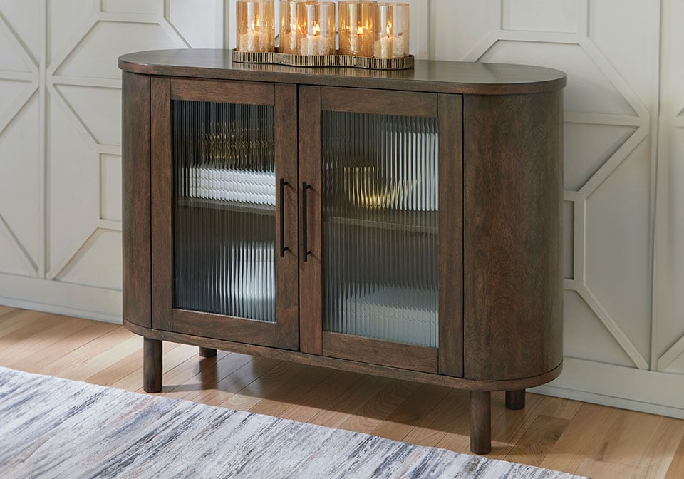 A masterclass in casual design, this accent cabinet’s capsule shape strikes a superbly fluid pose. Behind wood-framed doors with fluted glass inserts and black metal door pulls, you’ll find a fixed shelf for simple and streamlined storage. Functional and fabulous, it’s a welcome addition to your living area or entryway.