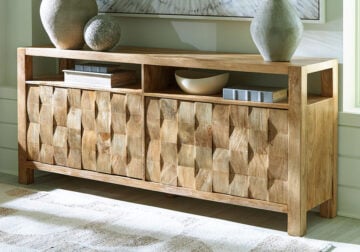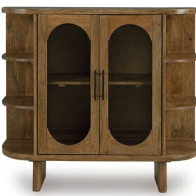 This accent cabinet puts a uniquely chic spin on a classic storage solution. It seamlessly blends clean lines with mid-century inspired curves, donning a light brown finish for that much more versatility. Exposed side shelves eagerly welcome your favorite decorative pieces, while additional shelves behind the glass-paneled doors offer ample storage.