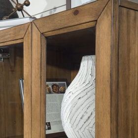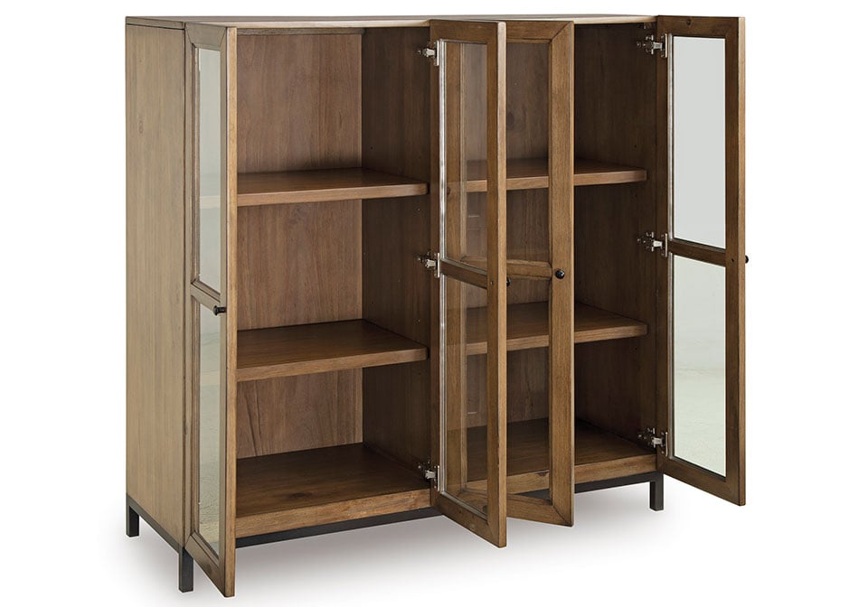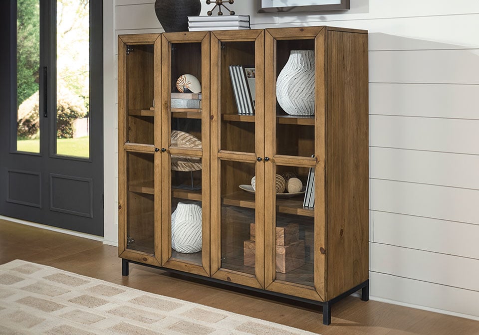 Versatile style teams up with must-have storage space. An elevated approach to the everyday, this accent cabinet is invitingly chic in a gray-brown finish. Soft-close hinges and adjustable shelving provide thoughtful functionality. Suiting spaces from casual to modern, this cabinet is equally chic in an entryway, living space or dining room.