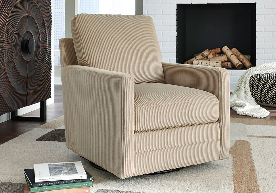 Clean-lined, contemporary style. Relaxed, homey comfort. This swivel chair has it all. Lightweight sand-hued corduroy upholstery makes it a cozy yet head-turning piece. Factor in the 360-degree spin, and you’ve got a win-win.