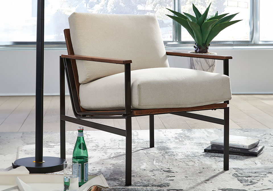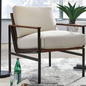 Unwind after a busy workday when you rest in this beautiful accent chair. A durable metal frame delivers intriguing industrial style with a rugged look as it ensures long-lasting stability. Plush, foam-filled cushions are wrapped in lovely fabric upholstery and provide a comfortable lounging spot in a master suite or home office. Combining elements for a mixed materials look that injects rustic flair into urban, contemporary or industrial aesthetics, this impressive chair adds eye-catching style.