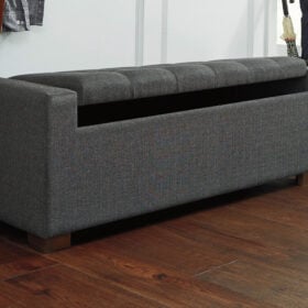 Whether gracing a front entry or living room, or placed at the foot of the bed, this upholstered storage bench is loaded with flair. Tufted cushioned seat with hinge reveals an ample storage compartment for this, that and the other. Gorgeous gray fabric is the epitome of neutral sophistication.