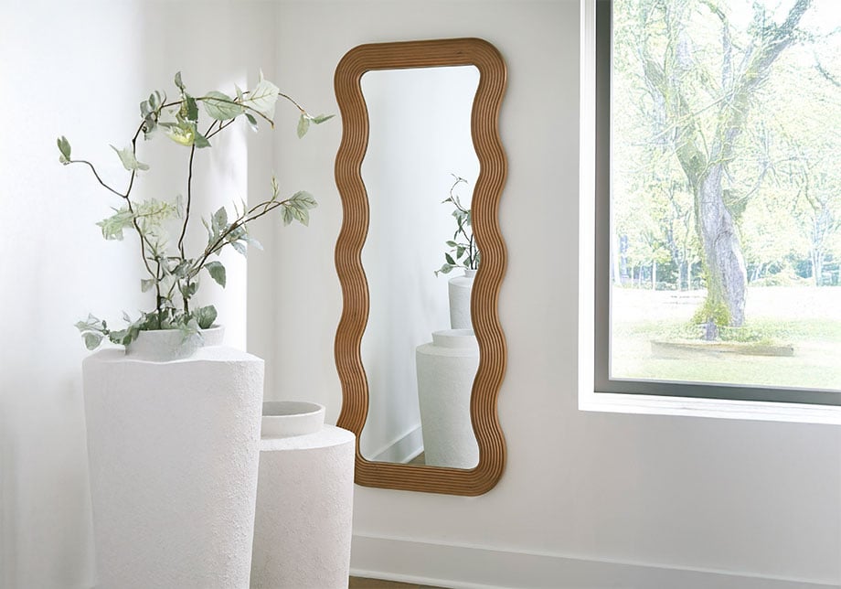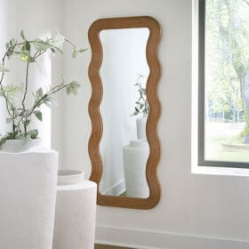 Reflect your taste for contemporary yet simple style with this floor mirror. The frame’s carved wave design brings visual intrigue without being too flashy, while its brown finish has a universal appeal. And the mirror’s full-length size lets you check your entire look from head to toe. Hang it vertically or horizontally to change up the vibe.