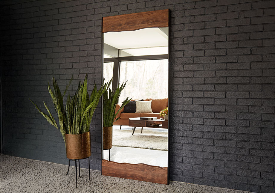 Simply striking and strikingly simple. The ultra clean lines and a mixed-media frame of brown finished wood and black finished metal make this floor mirror a complementary choice for so many spaces.