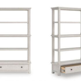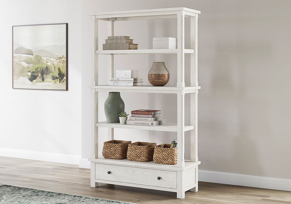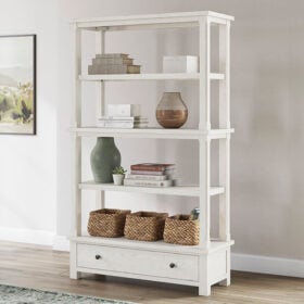 This bookcase is sure to impress when it’s time to study or work from home. With its antiqued white finish and wood grain texture, modern farmhouse-style workstations have never been so fashionable. The open four-shelf design is ideal for storage and displaying your treasures. And that large storage drawer brings even more function to your workspace. All that’s missing is you.