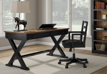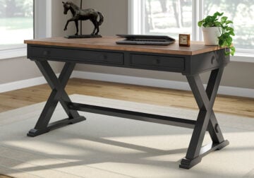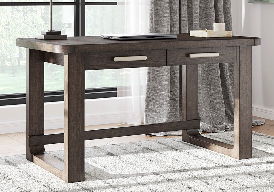 Classic meets contemporary in this home office desk. Its rich, dark wood tone and rounded corners suit today’s trends while balancing a timeless appeal. And with two storage drawers for work and study essentials, this desk gives your office a dose of both form and function.