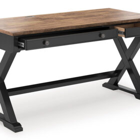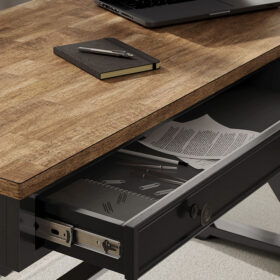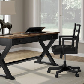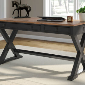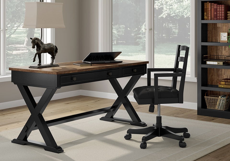 Raise the bar on modern farmhouse style with this home office desk. Its casual good looks are accentuated with a two-tone finish, which pairs a warm satin black base with a contrasting butcher block veneer desktop. The drop-down keyboard and cord management raceway bring both form and function to your at-home workspace. Use this desk as a stand-alone work area, or combine it with the matching desk return (sold separately) to create a larger work surface.