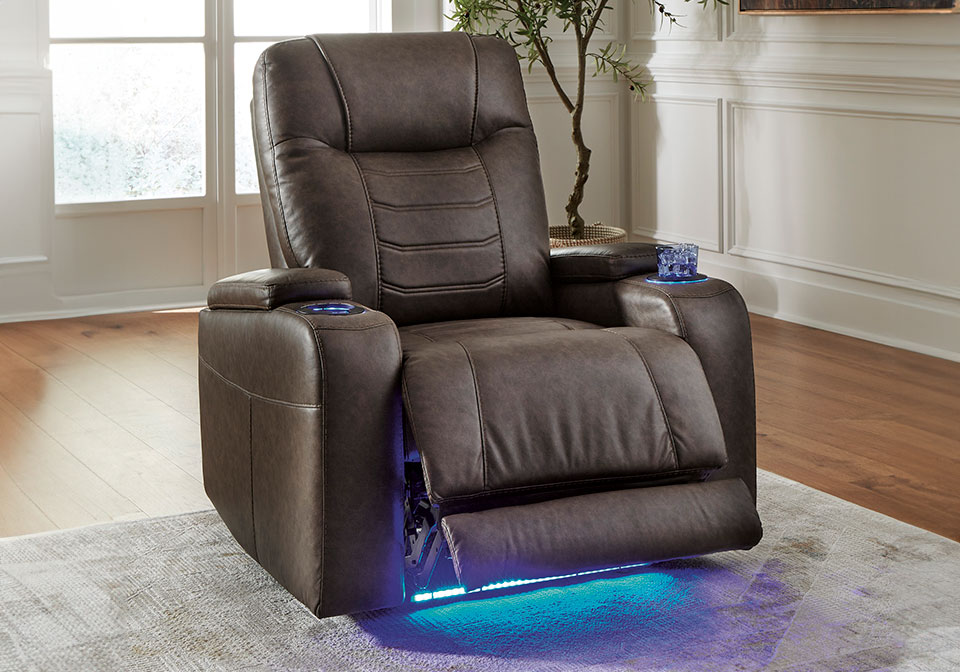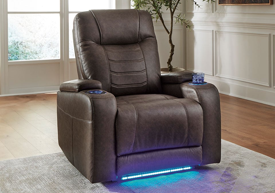 Elevate your movie nights with this power recliner. Its adjustable headrest ensures a perfect view of the TV no matter how far back you recline, and the extended ottoman offers extra space for maximum comfort. Stylish stitching and ambient LED lighting create a theater-style experience. Sit back, relax, and enjoy the show in complete comfort.
