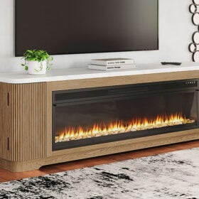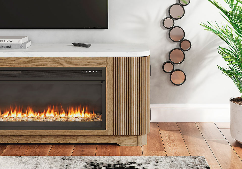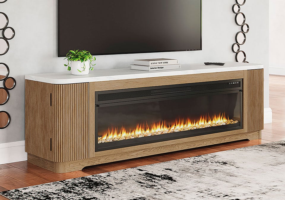 Elegance meets earthy charm in this TV stand with electric fireplace. Crafting a contemporary living room? The faux marble top expertly pairs with the reeded base for a trend-right take on day-to-day function. Open shelving and subtly integrated storage cabinets make it easy to store and display media accessories in style. For your added viewing pleasure, the wide fireplace insert gives you the cozy feel of a fireplace without the added hassle. With the touch of a button, adjust the temperature and the color-changing flames, and set the timer for long-lasting enjoyment. It comes with faux glass crystals and natural stones, so you can customize the look of the flame bed.