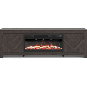 This TV stand with electric fireplace embraces a classically charming aesthetic and repurposes it for modern living. Its dark charcoal finish appeals to your love of vintage character, while a chic chevron pattern is effortlessly on trend. Media accessories stay tucked away in style thanks to hidden storage behind the doors. And for added ambiance, the electric fireplace brings a cozy-cool vibe to your living room. With the touch of a button, activate the LED-lit flame and adjust the temperature or the flame brightness. The flame effect includes multiple color options and a realistic-looking faux birch log set.
