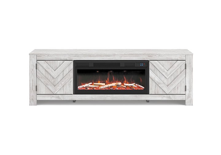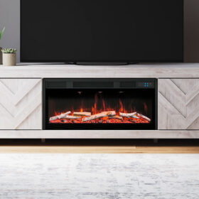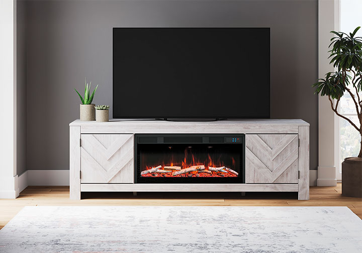 This TV stand with electric fireplace embraces a classically charming aesthetic and repurposes it for modern living. Its whitewash replicated paint appeals to your love of vintage character, while the chic chevron pattern is effortlessly on trend. Media accessories stay tucked away in style thanks to hidden storage behind the doors. And for added ambiance, the electric fireplace brings a cozy-cool vibe to your living room. With the touch of a button, activate the LED-lit flame and adjust the temperature or the flame brightness. The flame effect includes multiple color options and a realistic-looking faux birch log set.