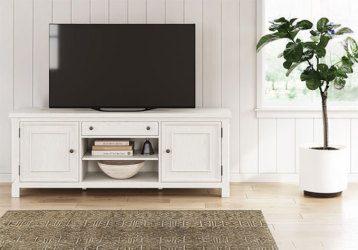 This TV stand is sure to impress when it’s time to relax after a tough day. With an antiqued white finish and wood grain texture, modern farmhouse-style design has never been so fashionable. Its cabinets and adjustable shelves are ideal for keeping all your equipment well organized and displaying your treasures. And that storage drawer is perfect for smaller accessories, bringing even more function to your entertainment space. All that’s missing is you.