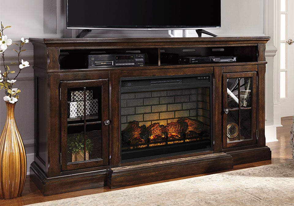 Roddinton Dark Brown TV Stand w/ Fireplace