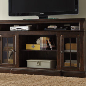 The beauty of this TV stand will immediately engage you. The slight breakfront shape is a rare find and an ideal fit among traditional and eclectic tastes. Soft black undertones highlight the warm finish. Multiple cubbies and glass-door enclosed shelves organize your audio/video components and plenty of extras. Sold separately, an electric fireplace fits neatly in the center cubby.