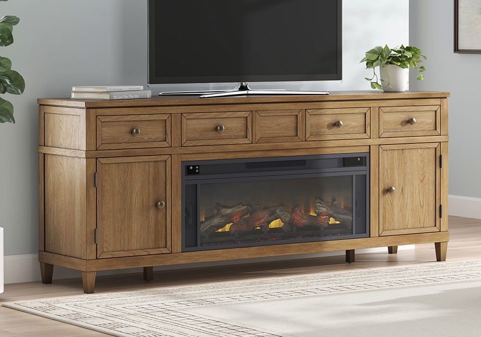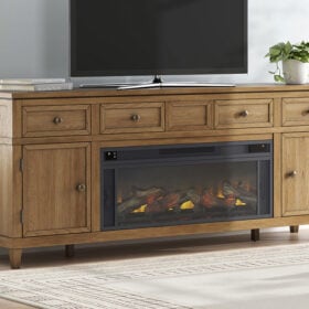 Taking a timeless approach to casual beauty, this TV stand with electric fireplace brings easygoing elegance to the everyday. With its light brown wood tone, it seamlessly slips into your room’s aesthetic. Two spacious cabinets (each with an adjustable shelf) and four drawers offer plenty of storage for media and electronics. Enhancing the experience, the fireplace insert brings a touch of warmth and beautiful ambiance to your living room. With the touch of a button, adjust the temperature and the flame brightness, and connect your device to the built-in wireless speakers. The flame effect includes a realistic-looking log set with glowing embers, along with an ambient down light.