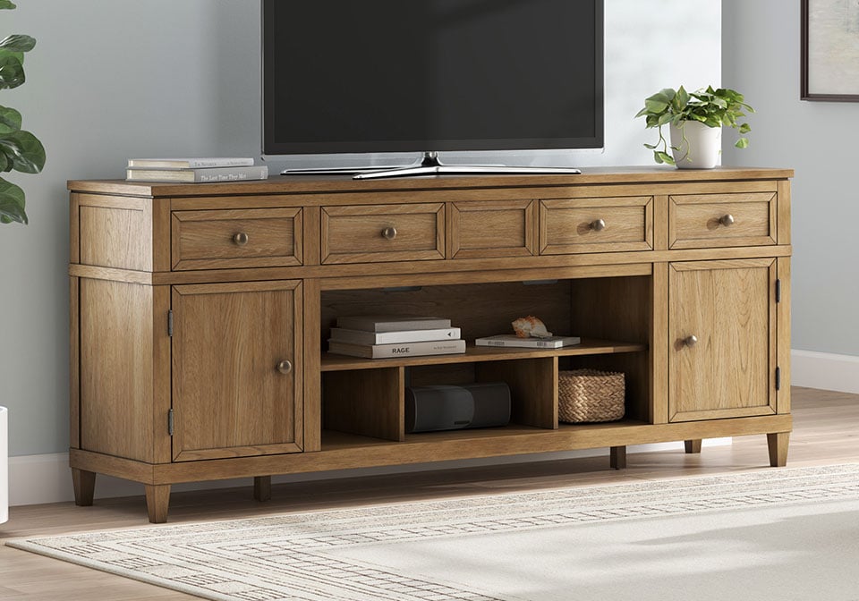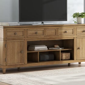 Taking a timeless approach to casual beauty, this TV stand brings easygoing elegance to the everyday. The light brown wood-tone finish seamlessly slips into your room’s aesthetic. Two spacious cabinets (each with an adjustable shelf), four drawers and an open center shelf offer plenty of storage for media and electronics. Enhancing the experience: the optional fireplace insert (sold separately) brings a touch of warmth and beautiful ambiance to your living room.