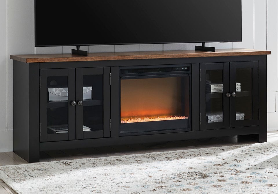 Raise the bar on modern farmhouse style with this TV stand with electric fireplace. Its sturdy silhouette and casual good looks are accentuated with a two-tone finish, which pairs a warm satin black base with a contrasting butcher block veneer top. Glass door cabinets with adjustable shelves offer plenty of storage for media and electronics. Adding that much more show-stopping style, the electric fireplace insert operates with or without heat and includes a six-level temperature setting, a remote control and an overheating control for added safety. It comes with faux glass crystals and natural stones, so you can customize the look of the flame bed.
