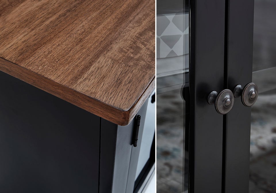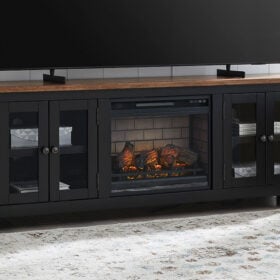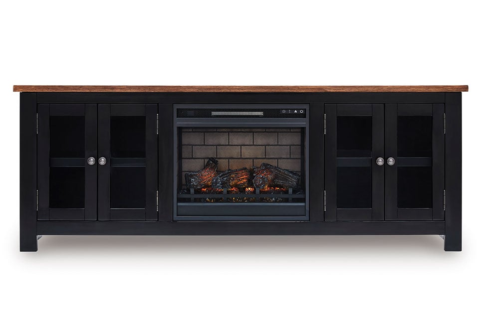 Raise the bar on modern farmhouse style with this TV stand with electric fireplace. Its sturdy silhouette and casual good looks are accentuated with a two-tone finish, which pairs a warm satin black base with a contrasting butcher block veneer top. Glass door cabinets with adjustable shelves offer plenty of storage for media and electronics. What really turns up the heat: an electric infrared fireplace insert with faux firebrick surround that operates with or without infrared heat. With the touch of a button, adjust the temperature and the flame brightness, and set the timer for long-lasting enjoyment.