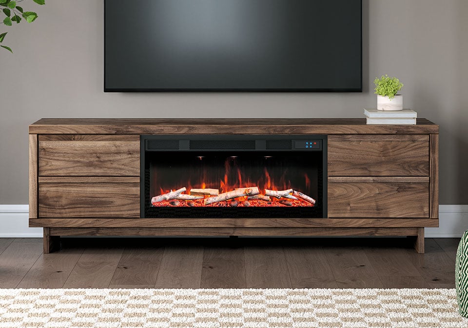 Nostalgic style, retooled for today’s trends. This TV stand with electric fireplace puts an elevated twist on mod aesthetics. Its warm brown tones reflect the mid-century vibes you love, while the angular base incorporates contemporary motifs. Integrated drawer handles round out the look in sleek style. For added ambiance, the electric fireplace brings a cozy-cool vibe to your living room. With the touch of a button, activate the LED-lit flame and adjust the temperature or the flame brightness. The flame effect includes multiple color options and a realistic-looking faux birch log set.