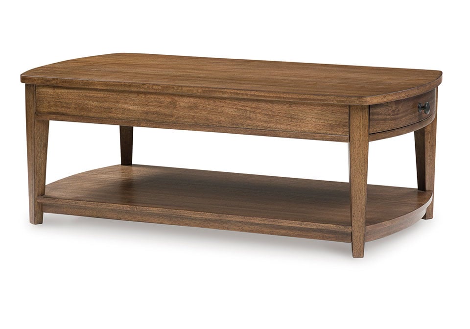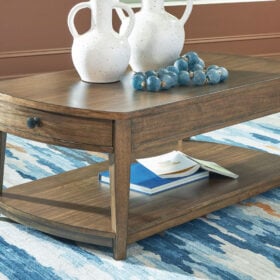 Serving up transitional style at its best, this striking coffee table looks equally at home in traditional and modern settings. Its classic brown finish merges effortlessly with a softly rounded top and tapered legs for a timeless, contemporary vibe. A lower shelf beautifully accommodates baskets, magazines, plants and more, while two end drawers keep entertainment essentials close by.