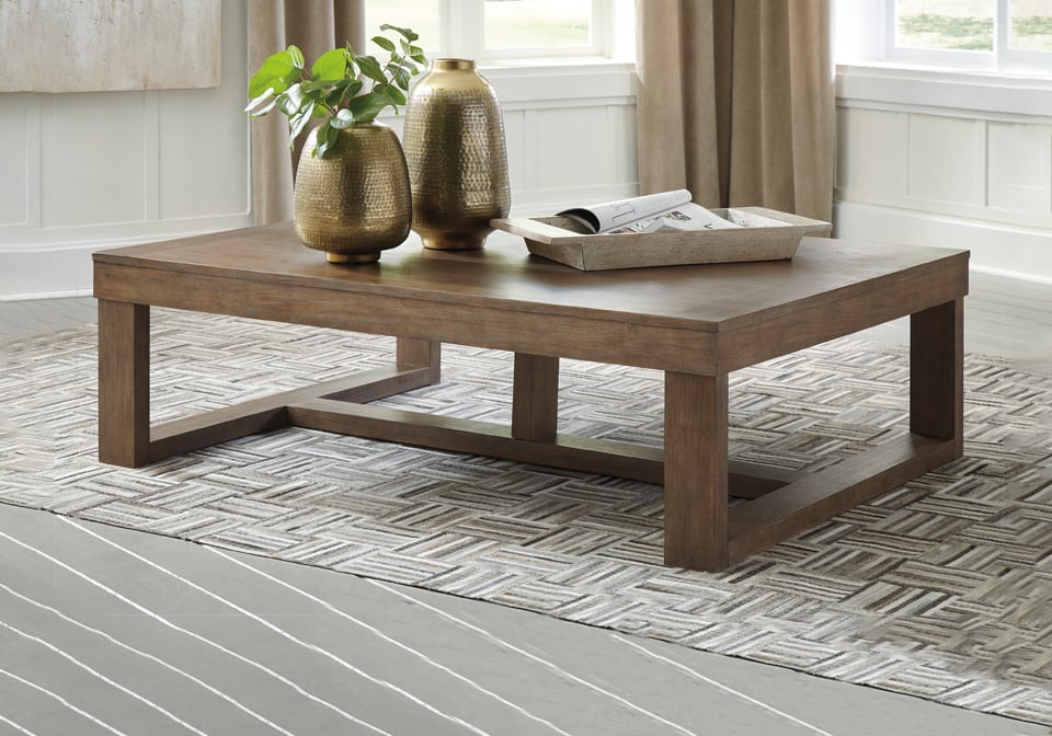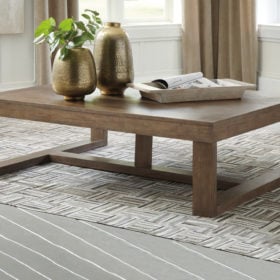Oversized yet far from overdone, this designer coffee table masters the art of simplicity. Bold, blocky profile is enriched with plank-effect styling and a textured grayish brown finish for a look that’s cool and contemporary and a vibe that’s warm and inviting. Its generous scale makes it a natural complement for spacious sectionals.