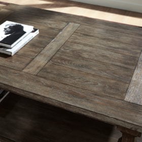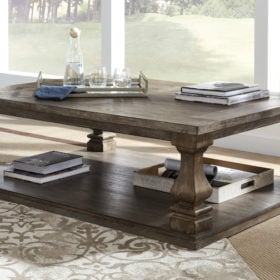 Homey. Hearty. Heavenly hued. Luring with a distressed weathered gray finish and square baluster legs set on a broad lower shelf for great presence, the Johnelle coffee table is sure to make your homestead feel that much more like home. The look is beautified with elm veneers and a framed and plank-effect tabletop for a richly crafted masterpiece made for years of satisfaction.